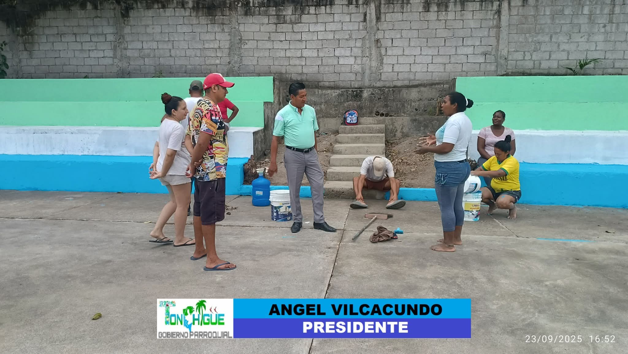 De acuerdo a lo manifestado por el presidente del comité de padres de familias, el Gobierno Parroquial entregó la pintura para darle mantenimiento a las gradas de la cancha de uso múltiple de este centro educativo (FHR)